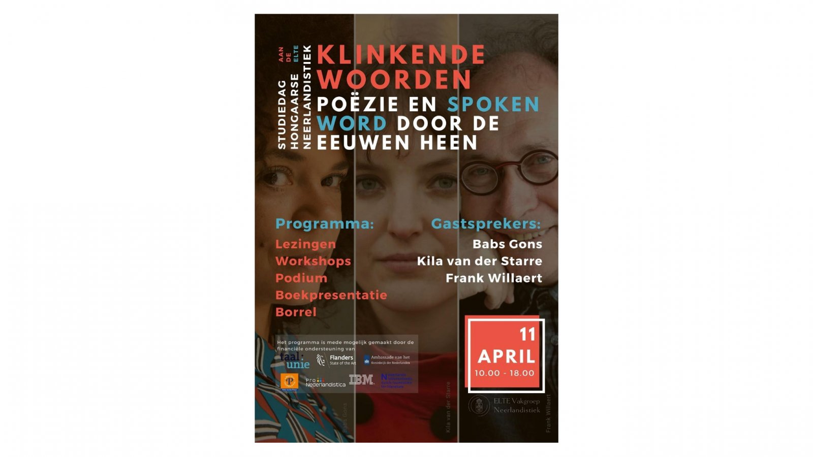 De jaarlijkse Studiedag van de Hongaarse Neerlandistiek werd afgelopen april georganiseerd door de Vakgroep Neerlandistiek aan de ELTE universiteit in Boedapest. De dag werd financieel ondersteund door de afdeling Arnhem. Het thema was 'Klinkende woorden - Poëzie en spoken word door de eeuwen heen'. Twee wetenschappers en een schrijver/dichter/docent/spoken word performer waren speciaal uit Vlaanderen en Nederland overgekomen.