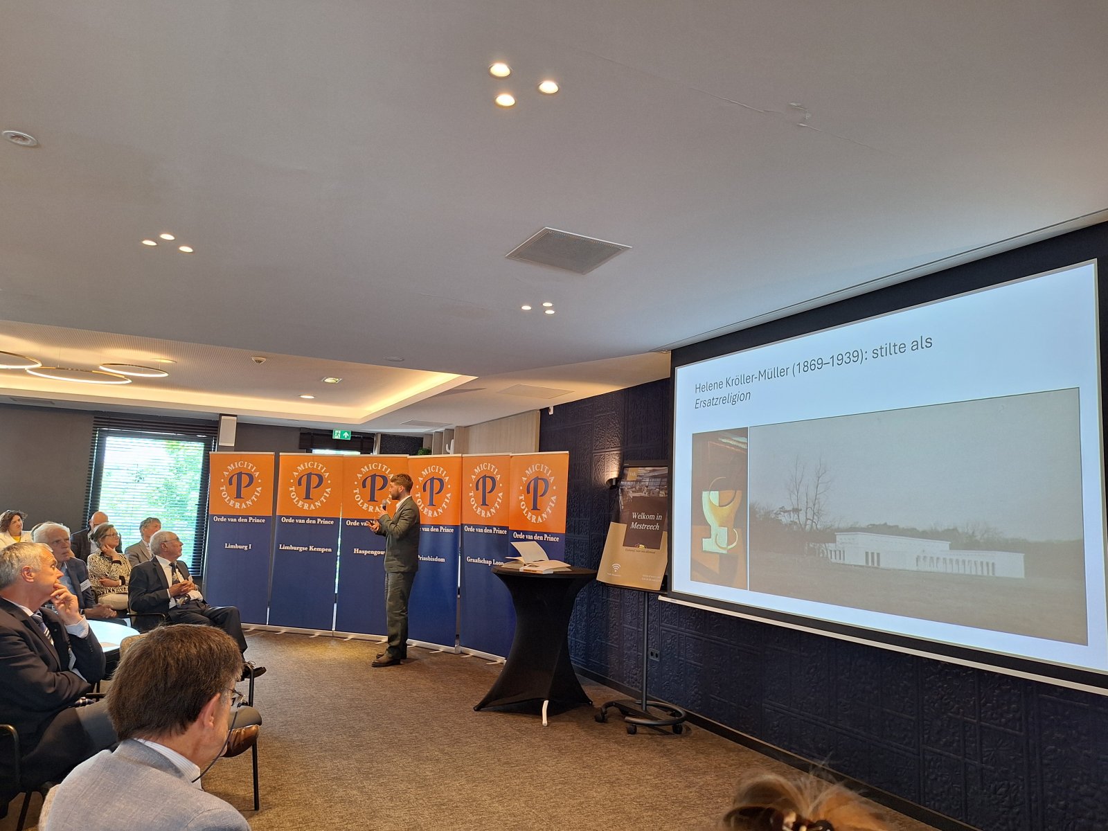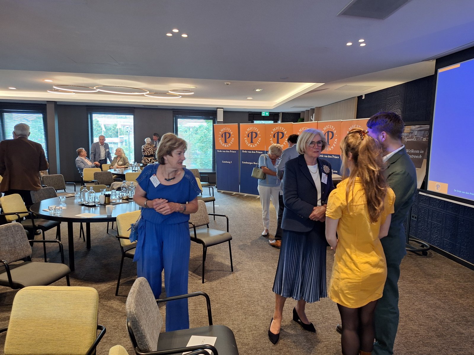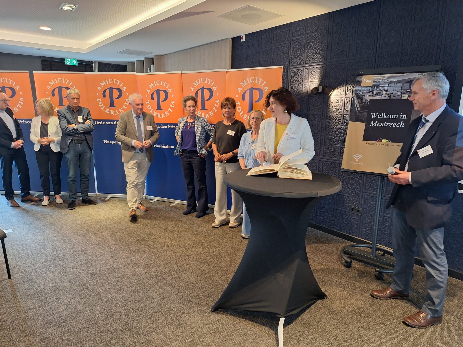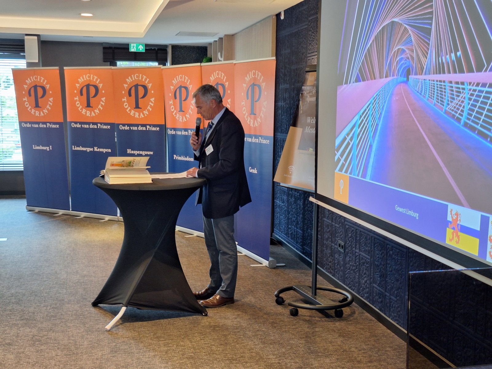 Na de pauze was er drie kwartier ingeruimd voor discussie en dialoog. Aan de hand van een aantal stellingen, waarop de bezoekers konden reageren met hun smartphones, kwam een levendige interactie op gang tussen bezoekers en de presentatoren. Een van de opmerkingen was: “Als alle Europeanen minimaal twee vreemde talen zouden moeten beheersen, zou iedereen prima met elkaar kunnen communiceren.” Vervolgens kreeg Peter Lepez, de gewestpresident, het woord. Allereerst was het tijd om de aanwezige nieuwe leden in het zonnetje te zetten en hen het Gulden Boek te laten tekenen. Vervolgens bedankte hij de afdeling Maastricht voor de vlekkeloze organisatie van deze dag en ging hij verder in op het thema bruggen bouwen. Hij benoemde de kracht van vriendschap en verdraagzaamheid, niet toevallig de pijlers waarop de Orde van den Prince is gebouwd. Vriendschap is de kracht die die bruggen draagt. Verdraagzaamheid is de sleutel tot het behouden van vrede en harmonie in onze samenleving. Wat ons in staat stelt om niet alleen samen te leven, maar ook echt verbinding aan te gaan, zijn twee krachtige krachten: taal en cultuur. Zij vormen de fundamenten voor vriendschap en verdraagzaamheid en zijn daarom dé kern waarrond de Orde van den Prince is gebouwd. Taal opent het gesprek. Cultuur opent het hart. Samen maken ze vriendschap en verdraagzaamheid mogelijk in een samenleving die steeds diverser wordt. Tot slot bedankte hij iedereen voor zijn en haar aanwezigheid.