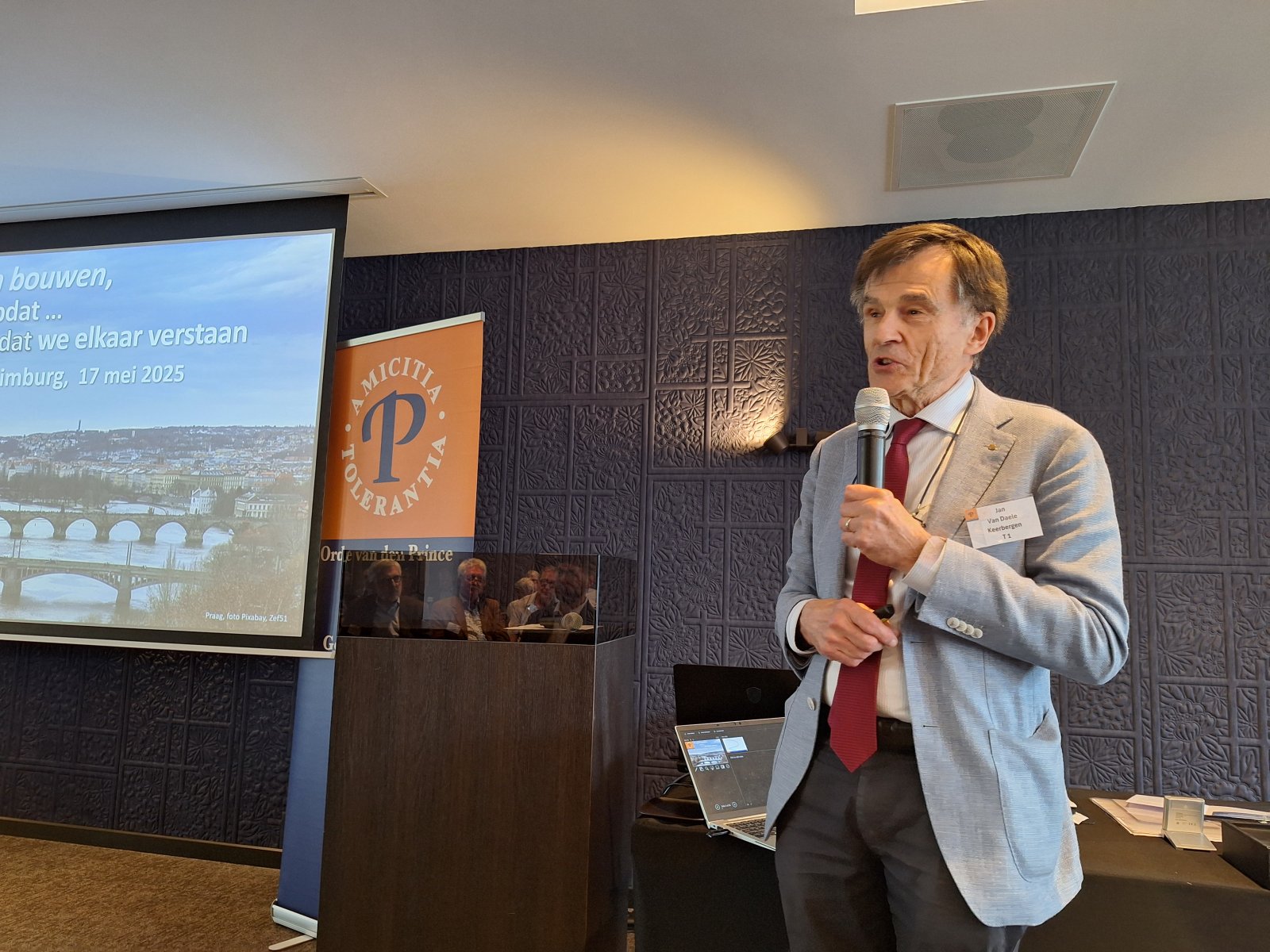Na deze inspirerende woorden, waar ook Henny van aangaf, dat ze er stil van werd, gaf de laatste het woord aan Jan van Daele, de president van het Orde-van-den-Prince-genootschap. Hij begon met aan te geven, dat voor hem de materie enigszins vreemd was gezien zijn achtergrond als burgerlijk ingenieur. Vervolgens dook hij in de historie van de Orde van den Prince om te zoeken naar hoe het genootschap zich als behorend tot het middenveld moet verhouden tot de toenemende conflicten, polarisatie en intolerantie in deze tijd. Mogen we ook nog neutraal zijn? Zijn er grenzen aan tolerantie? Het gaat daarbij over onverschilligheid, stil verzet, waakzaam blijven, maar toch blijven genieten van wat ons verbindt. Daarbij kwam hij uiteindelijk uit bij taal en cultuur als bruggenbouwer.